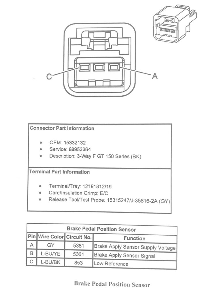 The switch is a three pin device with an arm which is pushed by the brake by a horizontal pin and moved along with depth of the pedal. According to documentation, it has three connections: A grey supply voltage line going to connector pin A, Blue/Yellow signal wire going to pin B, and Blue/Black low reference wire going to C. A variable switch reading so the Body Control Module knows how hard you are pressing the brakes.