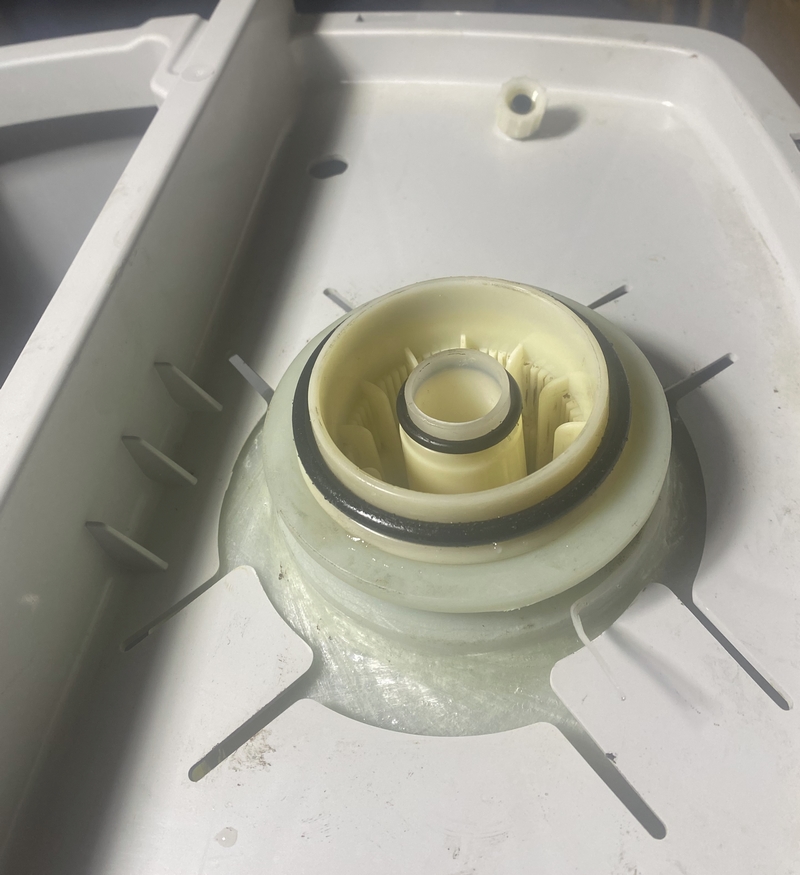 As for the rest of the head, I cleaned as much as possible without disassembling. Then partial reassembly in prep for new resin.The float was installed into the brine tank along with the cylinder and then the top cap which holds the cylinder in place was added. Next, the center water tube was placed in the cylinder. A bit of duct tape supported it and it was also capped with duct tape to prevent resin falling in.